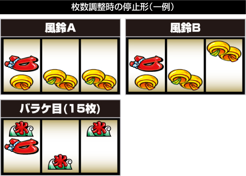 枚数調整時の出目が少し変わっていて、風鈴B(斜めベル)はベルが揃わないような形で停止します。